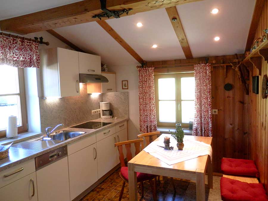 - eine separate Küche (Elektroherd mit Ceranfeld, Kühlschrank mit Gefrierfach, Mikrowelle, Spülmaschine) mit Essecke